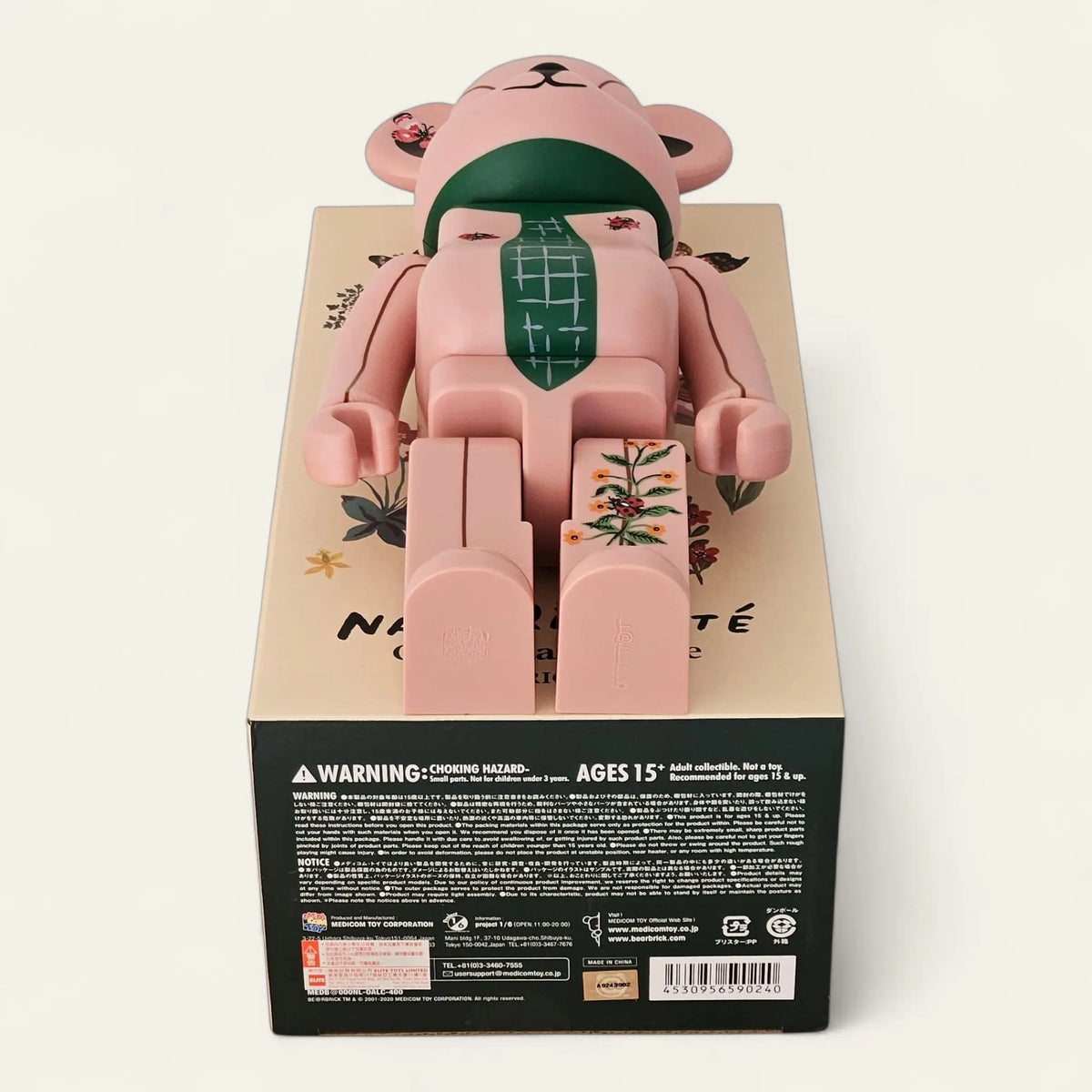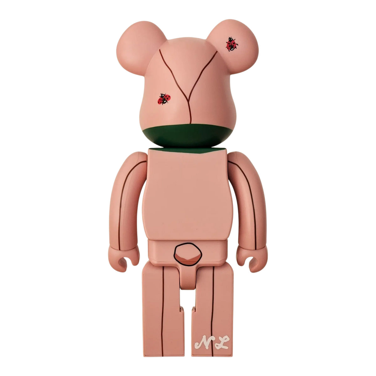 Die sanfte rosafarbene Oberfläche bildet die perfekte Leinwand für Létés verspieltes Design. Der Bärenkopf zeigt ein liebevolles Gesicht mit schwarzen Knopfaugen und einer dezenten Nase, während ein zarter roter Schmetterling das linke Ohr schmückt. Das besondere Highlight ist die dunkelgrüne Krawatte mit weißem Karomuster, die dem Bearbrick seinen Namen verleiht und ihm einen charmant-gentlemenhaften Touch verleiht. Auf Körper und Beinen verteilen sich handgemalte Details aus dem Original-Kunstwerk: rote Schmetterlinge und zarte orangefarbene Blüten, die der Figur eine märchenhafte Leichtigkeit verleihen. Die Rückseite zeigt weitere botanische Motive, darunter eine detaillierte Blume am Bein und dekorative Elemente, die Létés charakteristische Liebe zur Natur widerspiegeln.