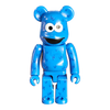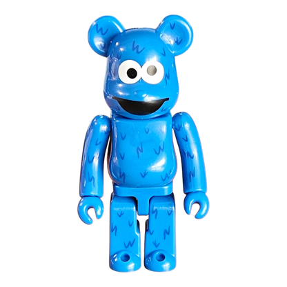 Die Gestaltung besticht durch ihr schimmerndes, transparentes Blau, das dem Bearbrick eine fast kristalline Qualität verleiht. Das leuchtend blaue Finish mit leichten Farbverläufen lässt die Figur je nach Lichteinfall changieren. Über den gesamten Körper verteilt sind kleine dunkelblaue W-förmige Muster, die an Cookie Monsters zotteliges Fell erinnern. Das Gesicht zeigt seine charakteristischen großen googly eyes, wobei die weißen Augen mit schwarzen Pupillen leicht schielend nach außen blicken, was dem Cookie Monster seinen typisch liebenswert-chaotischen Ausdruck verleiht. Der breite schwarze Mund ist zu seinem bekannten Grinsen geformt, bereit für den nächsten Keks. Das glänzende Finish und die durchscheinende Qualität verleihen diesem Secret-Bearbrick einen besonderen Premium-Charakter.