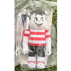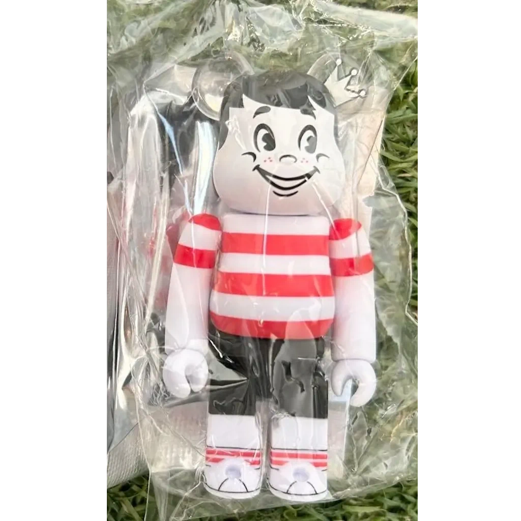 Dieser 7 cm große SECRET-Bearbrick ist eine Hommage an die 1960er-Jahre, als Matty zwischen 1961 und 1963 als eine der ersten sprechenden Puppen nach Chatty Cathy auf den Markt kam und seine eigene TV-Show "Matty's Funday Funnies" (1959-1961) auf ABC moderierte. Das Design fängt den klassischen Look perfekt ein: Das Gesicht zeigt Mattys charakteristisches, breites Lächeln mit großen, freundlichen Augen und der typischen Lockenfrisur unter einer grauen Krone – das Symbol der Mattel-Königsherrschaft im Spielzeuguniversum. Der Körper trägt das ikonische rot-weiß gestreifte T-Shirt, das Matty zu seiner unverwechselbaren Figur machte, kombiniert mit schwarzer Hose und weißen Schuhen mit roten Details.